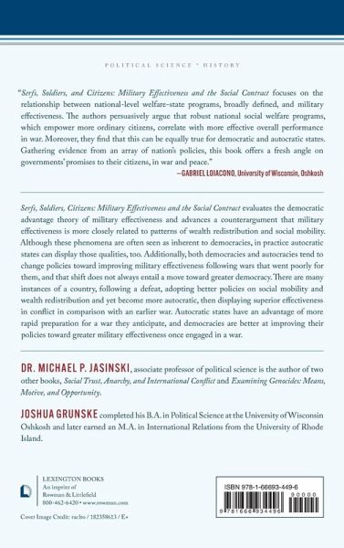Serfs, Soldiers, Citizens: Military Effectiveness and the Social Contract evaluates the democratic advantage theory of military effectiveness and advances a counterargument that military effectiveness is more closely related to patterns of wealth redistribution and social mobility. While these phenomena are often seen as inherent to democracies, in practice autocratic states can display those qualities, too. Additionally, both democracies and autocracies tend to change policies toward improving military effectiveness following wars that went poorly for them, and that shift does not always entail a move towards greater democracy. There are many instances of a country, following a defeat, adopting better policies on social mobility and wealth redistribution and yet become more autocratic, then displaying superior effectiveness in conflict in comparison with an earlier war. Autocratic states have an advantage of more rapid preparation for a war they anticipate, while democracies are better at improving their policies toward greater military effectiveness once engaged in a war.