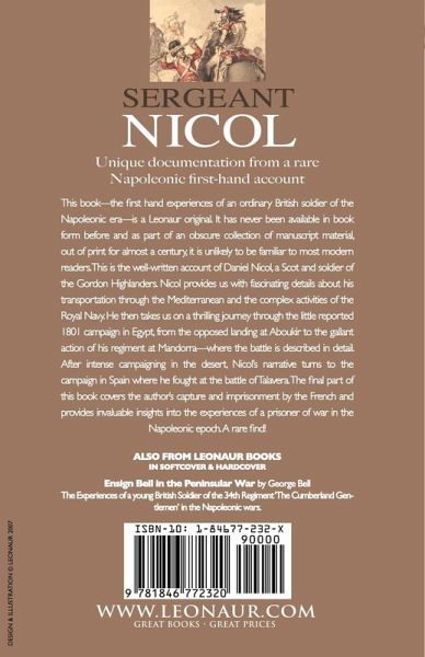Unique documentation from a rare Napoleonic first-hand account This book-the first hand experiences of an ordinary British soldier of the Napoleonic era-is a Leonaur original. It has never been available in book form before and as part of an obscure collection of manuscript material, out of print for almost a century, it is unlikely to be familiar to most modern readers. This is the well-written account of Daniel Nicol, a Scot and soldier of the Gordon Highlanders. Nicol provides us with fascinating details about his transportation through the Mediterranean and the complex activities of the Royal Navy. He then takes us on a thrilling journey through the little reported 1801 campaign in Egypt, from the opposed landing at Aboukir to the gallant action of his regiment at Mandorra-where the battle is described in detail. After intense campaigning in the desert, Nicol's narrative turns to the campaign in Spain where he fought at the battle of Talavera. The final part of this book covers the author's capture and imprisonment by the French and provides invaluable insights into the experiences of a prisoner of war in the Napoleonic epoch. A rare find!