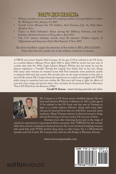 Today's News Headlines: ¿ Military suicides rise to a record 349, topping number of troops killed in combat By Washington Post, January 14, 2013 ¿ Suicide Crisis Mounts For US Soldiers And Veterans, July 16, 2012 Home Headline News ¿ Topics in Brief: Substance Abuse among the Military, Veterans, and their Families National Institute on Drug Abuse, April 2011 ¿ One U.S. veteran attempts suicide every 80 minutes: Hidden tragedy of Afghanistan and Iraq wars Daily Mail Reporter 3 Nov. 2011 ------------------------------------------------------------------------------ The above headlines caught the attention of the media in 2011, 2012 and 2013. Since that time the suicide rate in the military continues to increase. A TRUE story about Stephen Paul Campos. At the age of 19 he enlisted in the US Army as a combat infantry rifleman. From April 1968 to April 1969 he served one year tour of combat duty with the 199th. Light Infantry Brigade. Within just two weeks he and his platoon experience a "horrific" friendly-fire tragedy that shakes him to his core. Along with many other veterans he returned home with Post-traumatic stress syndrome unable to integrate fully back into society. Two decades later, on the verge of suicide, he was able to turn his life around. Mr. Campos shares his experiences in combat and struggles with PTSD while trying to transition back into civilian life. This story will bring to light the effects of post-war stress, drugs and alcohol abuse. Also, included are his personal Steps to Recovery. "You CAN Heal from the Demons of War" Gerald M. Korson - award winning journalist and editor