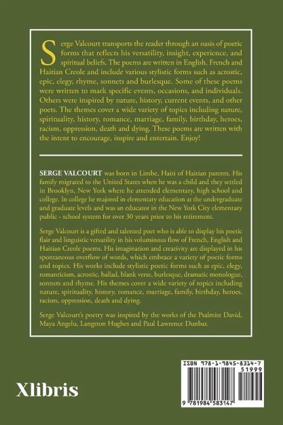Serge Valcourt was born in Limbe, Haiti of Haitian parents. His family migrated to the United States when he was a child and they settled in Brooklyn, New York where he attended elementary, high school and college. In college he majored in elementary education at the undergraduate and graduate levels and was an educator in the New York City elementary public - school system for over 30 years prior to his retirement. Serge Valcourt is a gifted and talented poet who is able to display his poetic flair and linguistic versatility in his voluminous flow of French, English and Haitian Creole poems. His imagination and creativity are displayed in his spontaneous overflow of words, which embrace a variety of poetic forms and topics. His works include stylistic poetic forms such as epic, elegy, romanticism, acrostic, ballad, blank verse, burlesque, dramatic monologue, sonnets and rhyme. His themes cover a wide variety of topics including nature, spirituality, history, romance, marriage, family, birthday, heroes, racism, oppression, death and dying. Serge Valcourt's poetry was inspired by the works of the Psalmist David, Maya Angelu, Langston Hughes and Paul Lawrence Dunbar.