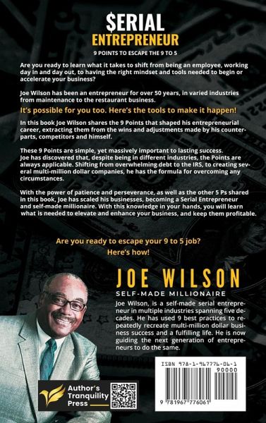 Are you ready to learn what it takes to shift from being an employee, working day in and day out, to having the right mindset and tools needed to begin or accelerate your business? Joe Wilson has been an entrepreneur for over 50 years, in varied industries from manufacturing to the hospitality business. "It's possible for you too. Here's the tools to make it happen!" In this book Joe Wilson shares the 9 Points that shaped his entrepreneurial career, extracting them from the wins and adjustments made by his counterparts, competitors, and himself. These 9 Points are simple, yet massively important to lasting success. Joe has discovered that despite being in different industries, the Points are always applicable. Shifting from overwhelming debt to the IRS, to creating several multi-million-dollar companies, he has the formula for overcoming any circumstances. With the power of patience and perseverance, as well as the other 5 Ps shared in this book, Joe has scaled his businesses becoming a Serial Entrepreneur and self-made millionaire. With this knowledge in your hands, you will learn what is needed to elevate and enhance your business, and keep them profitable. Are you ready to escape your 9 to 5 job? Here's how!