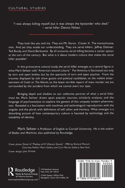 In this provocative cultural study, the serial killer emerges as a central figure in what Mark Seltzer calls 'America's wound culture'. From the traumas displayed by talk show guests and political candidates, to the violent entertainment of Crash or The Alienist, to the latest terrible report of mass murder, we are surrounded by the accident from which we cannot avert our eyes. Bringing depth and shadow to our collective portrait of what a serial killer must be, Mark Seltzer draws upon popular sources, scholarly analyses, and the language of psychoanalysis to explore the genesis of this uniquely modern phenomenon. Revealed is a fascination with machines and technological reproduction, with the singular and the mass, with definitions of self, other, and intimacy. What emerges is a disturbing picture of how contemporary culture is haunted by technology and the instability of identity.