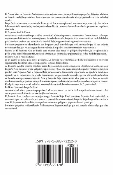 El Primer Viaje de Pequeño Azules un cuento escrito en rimas para que los niños pequeños disfruten a la hora de dormir. Las bellas y coloridas ilustraciones de este cuento emocionarán a los pequeños lectores de todas las edades. Pequeño Azul es un coche nuevo y brillante y está deseando explorar el mundo en su primer viaje. Sus padres le han enseñado a conducir y qué esperar en las calles de camino a la casa de su abuela, pero este es su primer viaje solo El Pequeño Azul Se Pierde es un cuento escrito en rima para niños pequeños.La historia presenta encantadoras ilustraciones a color que seguramente disfrutarán los lectores jóvenes de todas las edades.Pequeño Azul ahora confía en sus habilidades para conducir y ofrece a su mamá ir a la tienda.Ella le pregunta si está seguro de que conoce Los niños pequeños se identificarán con Pequeño Azul a medida que se da cuenta de que tal vez todavía necesita ayuda y que no estan grande como él cree. Los padres y maestros también pueden usar la historia de El Pequeño Azul Se Pierde para enseñar a los niños los peligros de perderse,de ser aprensivos y pedir ayuda cuando la necesitan,mientras aprenden de sus muchas experiencias de vida a medida que crecen. Pequeño Azul y Pequeña Roja es un cuento de rimas para niños pequeños. La historia va acompañada de bellas ilustraciones a color que seguramente deleitarán a todos los pequeños lectores de la historia. Al Pequeño Azul le encanta conducir cerca de su casa..Los niños pequeños se identificarán fácilmente con Pequeño Azul mientras ayuda a alguien en problemas y hace una buena acción. Los padres y maestros también pueden usar Pequeño Azul y Pequeña Roja para enseñar a los niños la importancia de ayudar a los demás, aprender de las experiencias de la vida, hacer nuevos amigos cuando menos lo esperan, y la fortaleza duradera de las relaciones personales.Pequeño Azul y Pequeña Roja es un cuento ideal para leer a la hora de dormir con los niños más pequeños, aunque los niños mayores también disfrutarán leyendo el cuento por su cuenta. Cualquiera que sea su edad, todos los lectores disfrutarán de la última aventura de Pequeño Azul. La Gran Carrera de Pequeño Azul es un cuento de rimas para niños pequeños. La historia cuenta con una serie de exquisitas ilustraciones a color que seguramente deleitarán a todos los jóvenes lectores. El Pequeño Azul conduce con su mejor amiga, Pequeña Roja. En el semáforo, Pequeño Azul es desafiado a una carrera por un coche verde más grande, a pesar de las advertencias de Pequeña Roja de que deberían irse a casa. El Pequeño Azul también sabe que las carreras son peligrosas y que no debería participar. Los niños pequeños se identificarán fácilmente con Pequeño Azul, ya que está tentado a hacer algo que sabe que está mal.