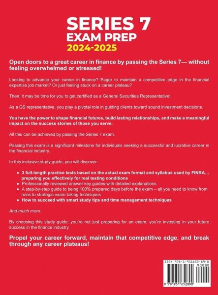 Open doors to a great career in finance by passing the Series 7- without feeling overwhelmed or stressed! Looking to advance your career in finance? Eager to maintain a competitive edge in the financial expertise job market? Or just feeling stuck on a career plateau? Then, it may be time for you to get certified as a General Securities Representative! As a GS representative, you play a pivotal role in guiding clients toward sound investment decisions. Your expertise empowers individuals to navigate the complexities of financial markets and facilitate strategic investments. You have the power to shape financial futures, build lasting relationships, and make a meaningful impact on the success stories of those you serve. All this can be achieved by passing the Series 7 exam. The Series 7 exam is a crucial licensing exam for individuals who wish to become General Securities Representatives, financial advisors, or stockbrokers. Passing this exam is a significant milestone for individuals seeking a successful and lucrative career in the financial industry. But just how do you manage to balance a career and studying for the certification? Any exam can be a dreadful experience, especially when your professional career is at stake. This comprehensive guide is tailored to meet the needs of busy professionals like yourself, providing a strategic and efficient approach to preparing for the Series 7 exam. Bringing together a wealth of strategic insights, expert study tips, and effective prioritization techniques, this guide empowers you to navigate through the exam's challenges with confidence. In this inclusive study guide, you will discover: 3 full-length practice tests based on the actual exam format and syllabus used by FINRA... preparing you effectively for real testing conditions Professionally reviewed answer key guides with detailed explanations... ensuring accuracy in every test item A step-by-step guide to being 100% prepared days before the exam - all you need to know from rules to strategic exam-taking techniques How to succeed with smart study tips and time management techniques (perfect for those with busy schedules) Comprehensive study materials that cover all 4 major functions of the Series 7 exam (plus bonus tips on prioritizing the study material) Complete Series 7 Exam FAQs - everything you need to know from qualifications and registration to critical do's and don'ts Sample calculations with solutions and insider techniques to conquer any financial math problem with ease And much more. By choosing this study guide, you're not just preparing for an exam; you're investing in your future success in the finance industry. Propel your career forward, maintain that competitive edge, and break through any career plateaus! If you want to launch a successful career in finance by getting certified, then you need this book today!