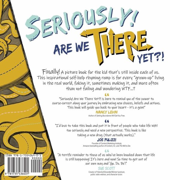 "Seriously! Are We There Yet?! is here to remind you of the power to course-correct along your journey by embracing new choices, beliefs and actions. This book will guide you back to your heart - it's a gem!" - Nancy Levin, author of Setting Boundaries Will Set You Free Finally! A picture book for the kid that's still inside each of us. "Seriously! Are We There Yet?! is an illustrated inspirational book for we "grownups" living in the real world, faking it, sometimes making it, and more often than not failing and wondering WTF...? How did we end up here? Where do we go now? How much longer 'til we "arrive"? Full of whimsy and wisdom, this self-help rhyming romp is for every one of us on life's journey who: wonder if we're the only ones who still haven't figured it all out; regret our past and are uncertain of our future; question our own purpose and self-worth; worry that time is running out and that this may be as good as it gets; can't stop the "coulda, woulda, shouldas" of almost every decision we've made; fear that we're missing out on the secret to life; and who stress about the possibility that we'll never make it to wherever it is we think we're supposed to be. "Seriously! Are We There Yet?! is a personal growth guide and reminder of the joy of living life as it was meant to be. It's a motivational self-help book offering wisdom that's not sugar-coated; rather, it speaks to what is and to objectively seeing things for what they could be in a digestible colorfully uplifting - yet practical - read. This book - written with a nod to Dr. Seuss - is the perfect gift to give to yourself and to loved ones from age one to 101 (or more). It's the much-needed encouragement to live in the moment and to enjoy the journey with all its winding and bumpy roads. Why wait to put a smile back on your face and a skip in your step? Buy this book now and start living like a kid, loving every step of your life's journey today!