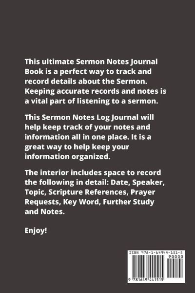 This beautiful, inspirational Sermons Notes workbook is a perfect way to write your notes from a sermon you will want to look back on, remember and reflect on later. Each page includes a space and section for: Date - For writing the Date. Speaker - Record who the Speaker was. Topic - Log the Topic of the sermon. Scripture References - Write the Scriptures used in the sermon. Prayer Requests - Keep track of Prayer Requests. Key Word - For writing the Keywords from the sermon. Further Study - Record what you would like to Study more. Notes - Record any other important information you want such as upcoming events, your personal prayers for the week, etc. If you love note taking of sermons, about the Bible & the word of God. This book is a great tool to help you organize your notes. Enhance your spiritual life and Christian worship by writing your important sermons all in one place. Simple & easy to use for women, men, children & kids alike. Can also make a wonderful gift. Convenient size, easy to take with you each week. 100 plus weeks. Get your copy today! Size is 6x9 inches, 110 pages, soft matte finish cover, white paper, black ink, paperback.