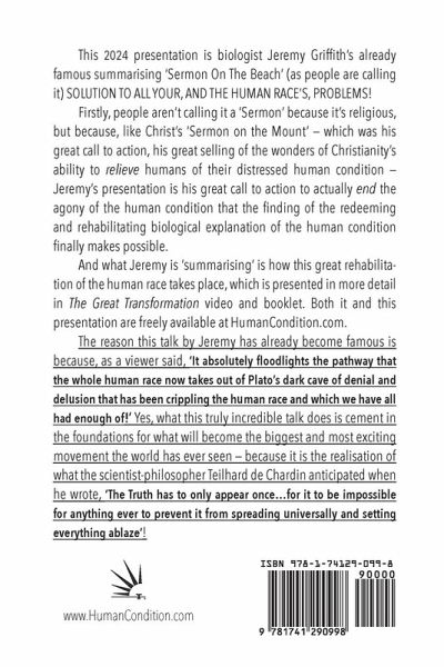 This 2024 presentation is biologist Jeremy Griffith's already famous summarising 'Sermon On The Beach' (as people are calling it) SOLUTION TO ALL YOUR, AND THE HUMAN RACE'S, PROBLEMS! Firstly, people aren't calling it a 'Sermon' because it's religious, but because, like Christ's 'Sermon on the Mount'-which was his great call to action, his great selling of the wonders of Christianity's ability to relieve humans of their distressed human condition-Jeremy's presentation is his great call to action to actually end the agony of the human condition that the finding of the redeeming and rehabilitating biological explanation of the human condition finally makes possible. And what Jeremy is 'summarising' is how this great rehabilitation of the human race takes place, which is presented in more detail in The Great Transformation video and booklet. Both it and this presentation are freely available at HumanCondition.com. The reason this talk by Jeremy has already become famous is because, as a viewer said, 'It absolutely floodlights the pathway that the whole human race now takes out of Plato's dark cave of denial and delusion that has been crippling the human race and which we have all had enough of!' Yes, what this truly incredible talk does is cement in the foundations for what will become the biggest and most exciting movement the world has ever seen-because it is the realisation of what the scientist-philosopher Teilhard de Chardin anticipated when he wrote, 'The Truth has to only appear once...¿for it to be impossible for anything ever to prevent it from spreading universally and setting everything ablaze'!