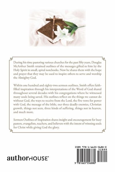 During his time pastoring various churches for the past fifty years, Douglas McArthur Smith retained outlines of the messages gifted to him by the Holy Spirit in small, spiral notebooks. Now he shares them with the hope and prayer that they may be used to inspire others to serve and worship the Almighty God. Within one hundred and eighty-two sermon outlines, Smith offers faith-filled inspiration through his interpretations of the Word of God shared throughout several decades with his congregations where he witnessed many souls being saved. His outlines reflect on the things we cannot do without God, the ways to receive from the Lord, the five vows for power with God, the message of the bible, our three deadly enemies, Christian growth, things not seen, three kinds of suffering, things not in heaven, and much more. Sermon Outlines of Inspiration shares insight and encouragement for busy pastors, evangelists, teachers, and believers with the intent of winning souls for Christ while giving God the glory.