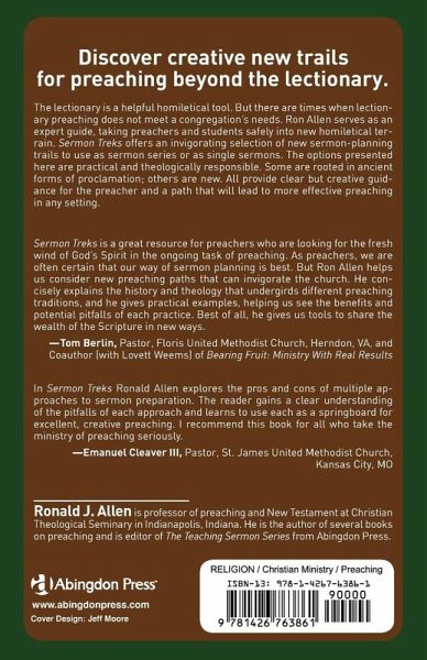 The lectionary is a helpful homiletical tool. But there are times when lectionary preaching does not meet a congregation's needs. Sermon Treks offers preachers and students an invigorating selection of new sermon-planning trails, for use as sermon series or for single sermons. The options presented here are practical and theologically responsible. Some are rooted in ancient forms of proclamation; others are new. All provide clear but creative guidance for the preacher, and a path that will lead to more effective sermons.