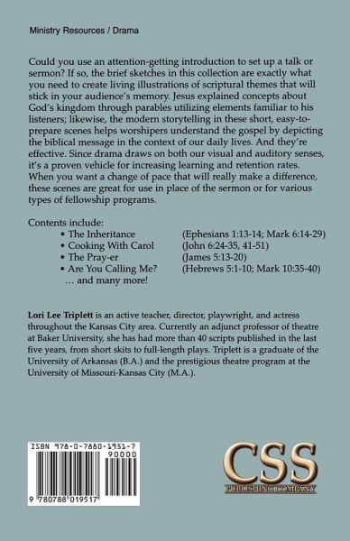 Could you use an attention-getting introduction to set up a talk or sermon? If so, the brief sketches in this collection are exactly what you need to create living illustrations of scriptural themes that will stick in your audience's memory. Jesus explained concepts about God's kingdom through parables utilizing elements familiar to his listeners; likewise, the modern storytelling in these short, easy-to-prepare scenes helps worshipers understand the gospel by depicting the biblical message in the context of our daily lives. And they're effective. Since drama draws on both our visual and auditory senses, it's a proven vehicle for increasing learning and retention rates. When you want a change of pace that will really make a difference, these scenes are great for use in place of the sermon or for various types of fellowship programs. Contents include: • The Inheritance (Ephesians 1:13-14; Mark 6:14-29) • Cooking With Carol (John 6:24-35, 41-51) • The Pray-er (James 5:13-20) • Are You Calling Me? (Hebrews 5:1-10; Mark 10:35-40) ... and many more! Lori Lee Triplett is an active teacher, director, playwright, and actress throughout the Kansas City area. Currently an adjunct professor of theatre at Baker University, she has had more than forty scripts published in the last five years, from short skits to full-length plays. Triplett is a graduate of the University of Arkansas (B.A.) and the prestigious theatre program at the University of Missouri-Kansas City (M.A.).