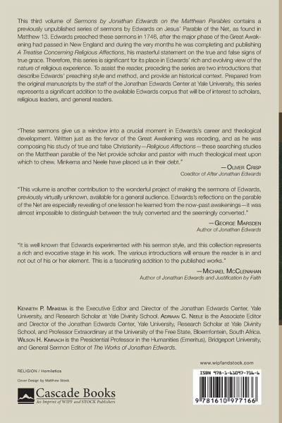 This third volume of Sermons by Jonathan Edwards on the Matthean Parables contains a previously unpublished series of sermons by Edwards on Jesus' Parable of the Net, as found in Matthew 13. Edwards preached these sermons in 1746, after the major phase of the Great Awakening had passed in New England and during the very months he was completing and publishing A Treatise Concerning Religious Affections, his masterful statement on the true and false signs of true grace. Therefore, this series is significant for its place in Edwards' rich and evolving view of the nature of religious experience. To assist the reader, preceding the series are two introductions that describe Edwards' preaching style and method, and provide an historical context. Prepared from the original manuscripts by the staff of the Jonathan Edwards Center at Yale University, this series represents a significant addition to the available Edwards corpus that will be of interest to scholars, religious leaders, and general readers.