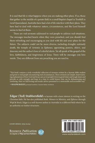 It is said that life is what happens when you are making other plans. If so, those that gather in the middle of a potato field in a small Baptist chapel in Tenthill in rural Queensland, Australia have had a lot of life interfere with their plans. They have had to deal with whatever nature, circumstances, and the Lord himself seems to hurl at them. These are real sermons addressed to real people to address real situations. The messages touched hearts when they were preached, and you should find them refreshing and encouraging as you deal with life and your plans for the future. The subjects could not be more diverse, including drought; untimely death; the temple of Artemis in Ephesus; appointing pastors, elders, and deacons; and the author's love of colorful shirts. Yet all speak of the gospel of the love, faithfulness, and forgiveness of Jesus. There will be messages you love inside. They are different from any preaching you are used to.