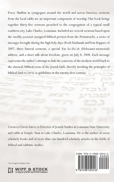 Every Shabbat in synagogues around the world and across America, sermons from the local rabbi are an important component of worship. This book brings together thirty-five sermons preached to the congregation of a typical small southern city, Lake Charles, Louisiana. Included are several sermons based upon the weekly parashah (assigned biblical portion from the Pentateuch), a series of messages brought during the high holy days (Rosh Hashanah and Yom Kippur) of 2007, three funeral sermons, a special Yom ha-Sho'ah (Holocaust-memorial) address, and a short talk about freedom, given on July 4, 2008. Each message represents the author's attempt to link the concerns of the modern world back to the classical, biblical roots of the Jewish faith, thereby invoking the principles of biblical faith to serve as guidelines in the twenty-first century.