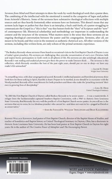 Sermons from Mind and Heart attempts to show the week-by-week theological work that a pastor does. The combining of the intellectual with the emotional is rooted in the categories of logos and pathos from Aristotle's Rhetoric. Some of the sermons have substantive theological reflections with multiple sources and are thus heavily footnoted; other sermons have no footnotes. This doesn't mean that any sermon lacks logos or pathos but that there is an interplay, a back-and-forth, of a pastor struggling to communicate the Gospel in a "this is that" way that honors both the "then" of Scripture and the "now" of contemporary life. Rhetorical scholarship and methodology are important in understanding the content and the structure of the sermons. What matters most is the sense that these sermons are an ongoing theological conversation between the pastor and his congregation. Sermons, after all, are meant to be heard, and they exist in the moment as authentic rhetorical acts. All other versions of the sermon, including this written form, are only echoes of the primal sermonic experience.