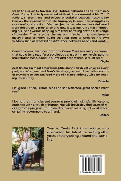 Traverse the life and times of one Thomas A. Cook. You will be truly rewarded and, at times, amazed at his tomfoolery, shenanigans, and entrepreneurial endeavors. Experience his life triumphs, failures and struggles in overcoming addiction. Hear the wisdom delivered from the green leather chair that created an invisible wall at the cliff edge of disaster and was instrumental in shifting his life direction. Enjoy the pertinent wisdom and life-changing perspective gained from living in nature and developing primitive living skills, the "difference between needs and wants." Cover to cover, a unique memoir that could be read for a psychology class on many levels: parenting, relationships, addiction, love and acceptance. A must read.