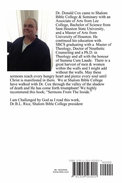I have heard sermons which kept me on the edge of my seat. I have heard sermons that put me to sleep, even when I'm not sleepy. This book, Sermons From The Inside, is an eclectic mixture of sermons I've given while in prison. There are appendices in an attempt to broaden the realms of homiletic as students study to be preachers. I also hope that the seasoned pastors who have simply burned out and are in need of fresh ideas can in some way benefit from this book. My main objective is to glorify God as people read these sermons.