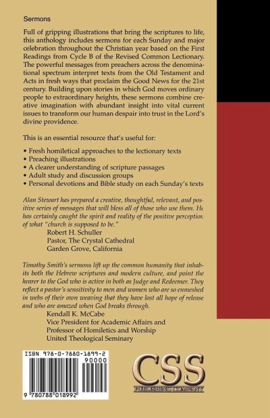 Full of gripping illustrations that bring the scriptures to life, this anthology includes sermons for each Sunday and major celebration throughout the Christian year based on the First Readings from Cycle B of the Revised Common Lectionary. The powerful messages from preachers across the denominational spectrum interpret texts from the Old Testament and Acts in fresh ways that proclaim the good news for the twenty-first century. Building upon stories in which God moves ordinary people to extraordinary heights, these sermons combine creative imagination with abundant insight into vital current issues to transform our human despair into trust in the Lord's divine providence. This is an essential resource that's useful for: • Fresh homiletical approaches to the lectionary texts • Preaching illustrations • A clearer understanding of scripture passages • Adult study and discussion groups • Personal devotions and Bible study on each Sunday's texts Alan Stewart has prepared a creative, thoughtful, relevant, and positive series of messages that will bless all of those who use them. He has certainly caught the spirit and reality of the positive perception of what "church is supposed to be." Robert H. Schuller Pastor, The Crystal Cathedral Garden Grove, California Timothy Smith's sermons lift up the common humanity that inhabits both the Hebrew scriptures and modern culture, and point the hearer to the God who is active in both as Judge and Redeemer. They reflect a pastor's sensitivity to men and women who are so enmeshed in webs of their own weaving that they have lost all hope of release and who are amazed when God breaks through. Kendall K. McCabe Vice President for Academic Affairs, Professor of Homiletics and Worship United Theological Seminary