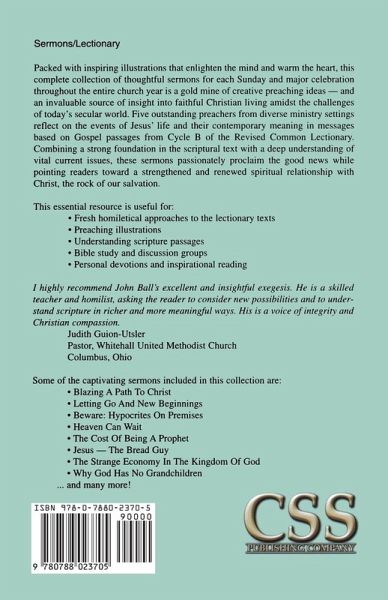 Packed with inspiring illustrations that enlighten the mind and warm the heart, this complete collection of thoughtful sermons for each Sunday and major celebration throughout the entire church year is a gold mine of creative preaching ideas -- and an invaluable source of insight into faithful Christian living amidst the challenges of today's secular world. Five outstanding preachers from diverse ministry settings reflect on the events of Jesus' life and their contemporary meaning in messages based on Gospel passages from Cycle B of the Revised Common Lectionary. Combining a strong foundation in the scriptural text with a deep understanding of vital current issues, these sermons passionately proclaim the Good News while pointing readers toward a strengthened and renewed spiritual relationship with Christ, the rock of our salvation. This essential resource is useful for: • Fresh homiletical approaches to the lectionary texts • Preaching illustrations • Understanding scripture passages • Adult study and discussion groups • Personal devotions and Bible study