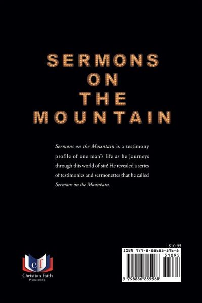 Sermons on the Mountain is a testimony profile of one man's life as he journeys through this world of sin! He revealed a series of testimonies and sermonettes that he called Sermons on the Mountain.