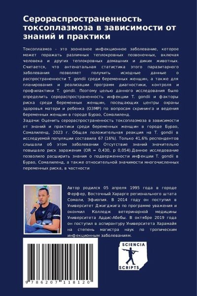 Toxoplazmoz - äto zoonoznoe infekcionnoe zabolewanie, kotoroe mozhet porazhat' razlichnyh teplokrownyh pozwonochnyh, wklüchaq cheloweka i drugih teplokrownyh domashnih i dikih zhiwotnyh. Schitaetsq, chto antenatal'naq statistika ätogo parazitarnogo zabolewaniq pozwolqet poluchit' ishodnye dannye o rasprostranennosti T. gondii sredi beremennyh zhenschin, a takzhe dlq planirowaniq i realizacii programm diagnostiki, kontrolq i profilaktiki T. gondii. Poätomu cel'ü dannogo issledowaniq bylo opredelit' serorasprostranennost' infekcii T. gondii i faktory riska sredi beremennyh zhenschin, poseschaüschih centry ohrany zdorow'q materi i rebenka (OZMR) po woprosam skrininga i wedeniq beremennyh zhenschin w gorode Burao, Somalilend.Zadachi: Ocenit' serorasprostranennost' toxoplazmoza w zawisimosti ot znanij i praktiki sredi beremennyh zhenschin w gorode Burao, Somalilend, 2023 g. Obschaq polozhitel'naq reakciq na T. gondii w issleduemoj populqcii sostawila 67 (16%). Tol'ko 41,6% respondentow slyshali ob ätom zabolewanii Otsutstwie znanij znachitel'no powyshalo risk zarazheniq (OR = 0,430, p 0,054).Dannoe issledowanie pozwolilo rasshirit' znaniq o podwerzhennosti infekcii T. gondii w Burao, Somalilend, a takzhe otnositel'noj znachimosti mnogochislennyh peremennyh riska, w chastnosti