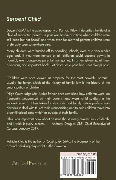 Serpent Child is the autobiography of Patricia Riley. It describes the life of a child of seperated parents in post war Britain at a time when children were still ‘seen but not heard’ and when even for married parents children were preferably seen somewhere else. Many children were hurried off to boarding schools, even at a very tender age; and, if they were noticed at all, children could become pawns in harmful, even dangerous parental war games. In an enlightening, at times humorous, and important book, Pat describes a past that is not always past. ‘Children were once viewed as property for…mehr