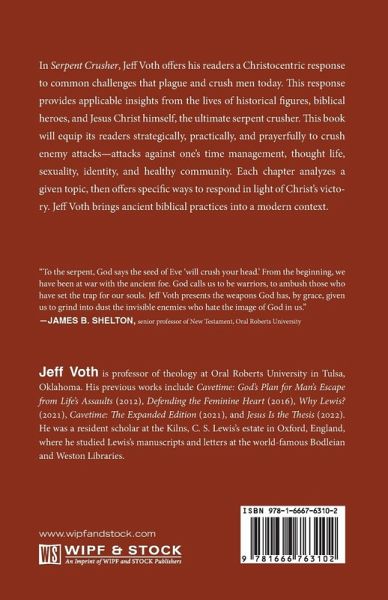 In Serpent Crusher, Jeff Voth offers his readers a Christocentric response to common challenges that plague and crush men today. This response provides applicable insights from the lives of historical figures, biblical heroes, and Jesus Christ himself, the ultimate serpent crusher. This book will equip its readers strategically, practically, and prayerfully to crush enemy attacks--attacks against one's time management, thought life, sexuality, identity, and healthy community. Each chapter analyzes a given topic, then offers specific ways to respond in light of Christ's victory. Jeff Voth brings ancient biblical practices into a modern context.