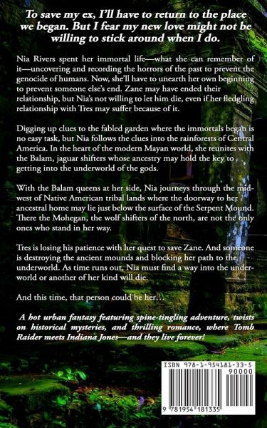 To save my ex, I'll have to return to the place we began. But I fear my new love might not be willing to stick around when I do. Nia Rivers spent her immortal life-what she can remember of it-uncovering and recording the horrors of the past to prevent the genocide of humans. Now, she'll have to unearth her own beginning to prevent someone else's end. Zane may have ended their relationship, but Nia's not willing to let him die, even if her fledgling relationship with Tres may suffer because of it. Digging up clues to the fabled garden where the immortals began is no easy task, but Nia follows the clues into the rainforests of Central America. In the heart of the modern Mayan world, she reunites with the Balam, jaguar shifters whose ancestry may hold the key to getting into the underworld of the gods. With the Balam queens at her side, Nia journeys through the midwest of Native American tribal lands where the doorway to her ancestral home may lie just below the surface of the Serpent Mound. There the Mohegan, the wolf shifters of the north, are not the only ones who stand in her way. Tres is losing his patience with her quest to save Zane. And someone is destroying the ancient mounds and blocking her path to the underworld. As time runs out, Nia must find a way into the underworld or another of her kind will die. And this time, that person could be her... Get this hot urban fantasy featuring spine-tingling adventure, twists on historical mysteries, and thrilling romance, where Tomb Raider meets Indiana Jones-and they live forever!