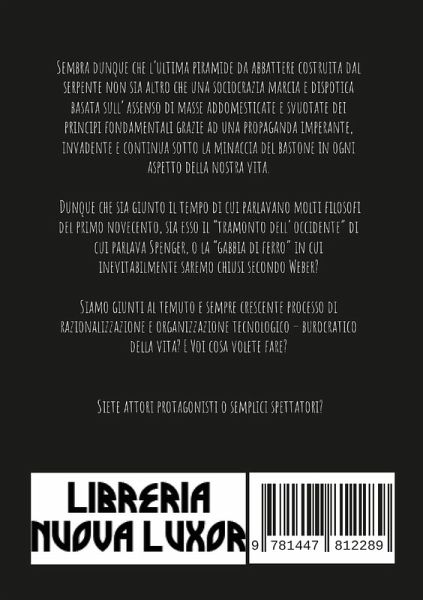 Sembra dunque che l'ultima piramide da abbattere costruita dal serpente non sia altro che una sociocrazia marcia e dispotica basata sull' assenso di masse addomesticate e svuotate dei principi fondamentali grazie ad una propaganda imperante, invadente e continua sotto la minaccia del bastone in ogni aspetto della nostra vita. Dunque che sia giunto il tempo di cui parlavano molti filosofi del primo novecento, sia esso il "tramonto dell' occidente" di cui parlava Spenger, o la "gabbia di ferro" in cui inevitabilmente saremo chiusi secondo Weber? Siamo giunti al temuto e sempre crescente processo di razionalizzazione e organizzazione tecnologico - burocratico della vita? E Voi cosa volete fare? Siete attori protagonisti o semplici spettatori?