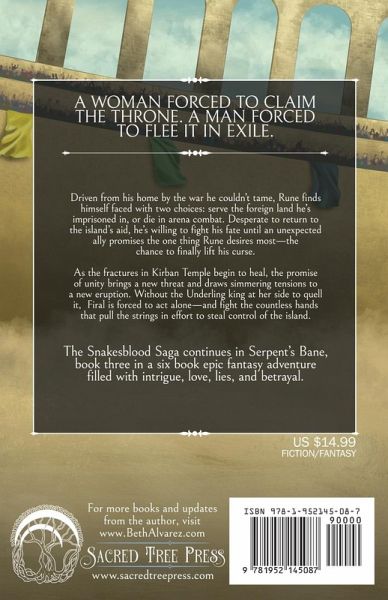 A woman forced to claim the throne. A man forced to flee it in exile. Driven from his home by the war he couldn't tame, Rune finds himself faced with two choices: serve the foreign land he's imprisoned in, or die in arena combat. Desperate to return to the island's aid, he's willing to fight his fate until an unexpected ally promises the one thing Rune desires most-the chance to finally lift his curse. As the fractures in Kirban Temple begin to heal, the promise of unity brings a new threat and draws simmering tensions to a new eruption. Without the Underling king at her side to quell it, Firal is forced to act alone-and fight the countless hands that pull the strings in effort to steal control of the island. The Snakesblood Saga continues in Serpent's Bane, book three in a six book epic fantasy adventure filled with intrigue, love, lies, and betrayal.