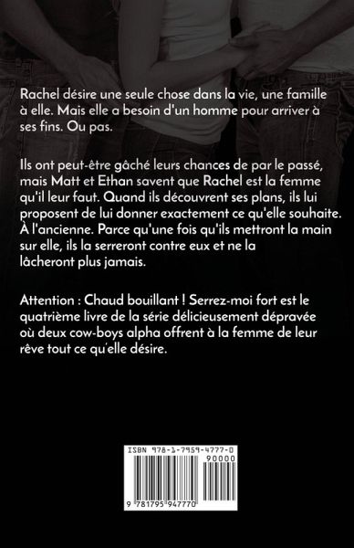 Rachel désire une seule chose dans la vie, une famille à elle. Mais elle a besoin d'un homme pour arriver à ses fins. Ou pas. Ils ont peut-être gâché leurs chances de par le passé, mais Matt et Ethan savent que Rachel est la femme qu'il leur faut. Quand ils découvrent ses plans, ils lui proposent de lui donner exactement ce qu'elle souhaite. À l'ancienne. Parce qu'une fois qu'ils mettront la main sur elle, ils la serreront contre eux et ne la lâcheront plus jamais. Attention : Chaud bouillant ! Serrez-moi fort est le quatrième livre de la série délicieusement dépravée où deux cow-boys alpha offrent à la femme de leur rêve tout ce qu’elle désire. Ce livre peut se lire seul, et c’est elle l’héroïne. Pas de scène homme / homme.