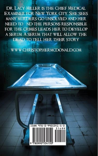 Dr. Lacy Miller is the Chief Medical Examiner for New York City. She sees many murders go unsolved and her need to find the persons responsible for the crimes leads her to develop a serum. A serum that will allow the dead to tell her their story. This highly unethical practice comes crashing down around her as the FBI and CDC become involved. The ripple effect of the serum continues to stack up leaving the world forever changed.