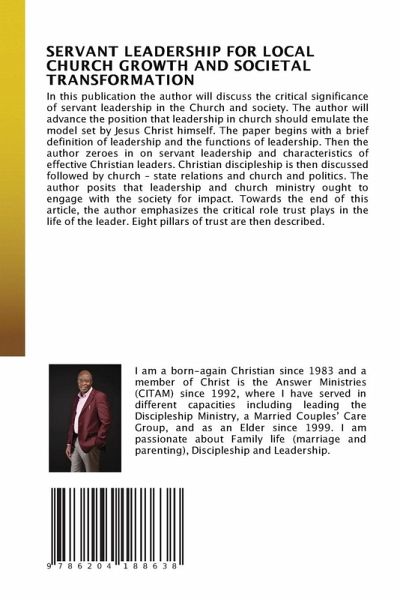 In this publication the author will discuss the critical significance of servant leadership in the Church and society. The author will advance the position that leadership in church should emulate the model set by Jesus Christ himself. The paper begins with a brief definition of leadership and the functions of leadership. Then the author zeroes in on servant leadership and characteristics of effective Christian leaders. Christian discipleship is then discussed followed by church - state relations and church and politics. The author posits that leadership and church ministry ought to engage with the society for impact. Towards the end of this article, the author emphasizes the critical role trust plays in the life of the leader. Eight pillars of trust are then described.