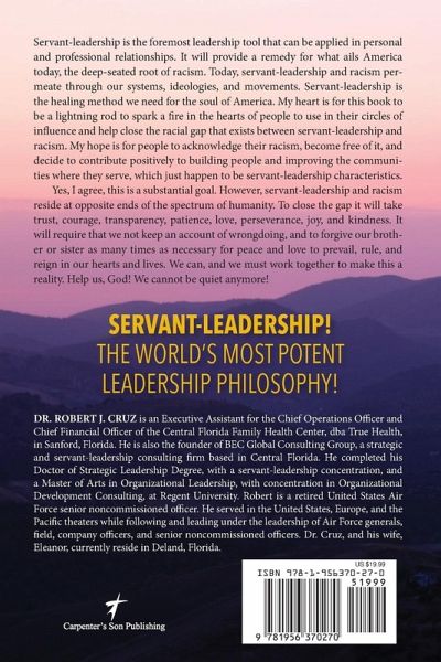 International Impact Book Awards, Author of the Year 2025 (Christian Book Category); Winner 2024 (Christian and Leadership Categories) Servant-Leadership, the world's most potent leadership philosophy! Servant-leadership is the foremost leadership tool that can be applied in personal and professional relationships. It provides a remedy for what ails America today, the deep-seated root of racism. Today, servant-leadership and racism permeate through our systems, ideologies, and movements. Servant-leadership is the healing method we need for the soul of America. This book aims to be a lightning rod to spark a fire in the hearts of people to use in their circles of influence and help close the racial gap that exists between servant-leadership and racism. The author's hope is for people to acknowledge their racism, become free of it, and decide to contribute positively to building people and improving the communities where they serve, which just happen to be servant-leadership characteristics. This is a substantial goal. However, servant-leadership and racism reside at opposite ends of the spectrum of humanity. To close the gap it takes trust, courage, transparency, patience, love, perseverance, joy, and kindness. It requires that we not keep an account of wrongdoing, and to forgive our brother or sister as many times as necessary for peace and love to prevail, rule, and reign in our hearts and lives. We can, and we must work together to make this reality.