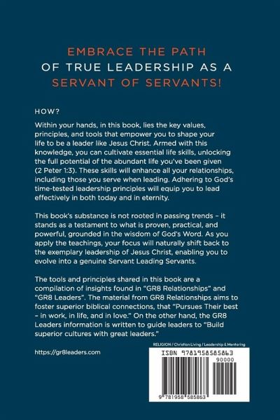 EMBRACE THE PATH OF TRUE LEADERSHIP AS A SERVANT OF SERVANTS HOW? Within your hands, in this book, lies the key values, principles, and tools that empower you to shape your life to be a leader like Jesus Christ. Armed with this knowlege, you can cultivate essential life skills, unlocking the full potential of the abundant life you've been given (2 Peter 1:3). These skills will enhance all your relationships, including those you serve when leading. Adhering to God's time-tested leadership principles will equip you to lead effectively in both today and in eternity. This book's substance is not rooted in passing trends - it stands as a testament to what is proven, practical, and powerful, grounded in the wisdom of God's Word. As you apply the teachings, your focus will naturally shift back to the exemplary leadership of Jesus Christ, enabling you to evolve into a genuine Servant Leading Servants. The tools and principles shared in this book are a compilation of insights found in "GR8 Relationships" and "GR8 Leaders." The material from GR8 Relationships aims to foster superior biblical connections that "pursues their best - in work, in life, and in love." On the other hand, the GR8 Leaders information is written to guide leaders to "build superior cultures with great leaders."