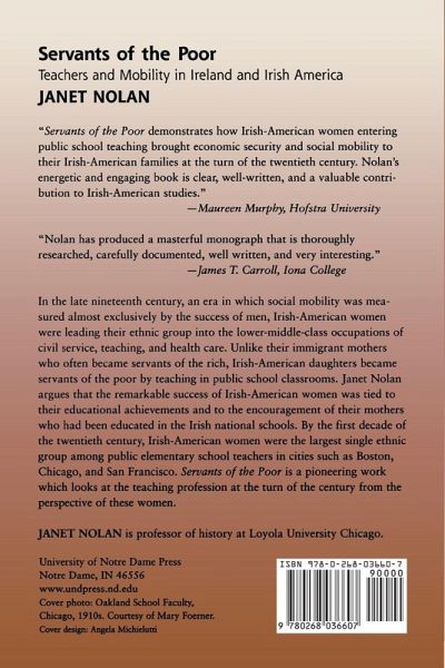 In the late nineteenth century, an era in which social mobility was measured almost exclusively by the success of men, Irish-American women were leading their ethnic group into the lower-middle-class occupations of civil service, teaching, and health care. Unlike their immigrant mothers who often became servants of the rich, Irish-American daughters became servants of the poor by teaching in public school classrooms. Janet Nolan argues that the remarkable success of Irish-American women was tied to their educational achievements and to the encouragement of their mothers who had been educated in the Irish national schools. By the first decade of the twentieth century, Irish-American women were the largest single ethnic group among public elementary school teachers in cities such as Boston, Chicago, and San Francisco. Servants of the Poor is a pioneering work which looks at the teaching profession at the turn of the century from the perspective of these women.