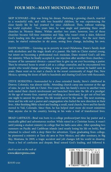 The author's memoir and stories of three others who pioneered ministries at ski resorts. The book focuses on their personal challenges: divorce, job loss, addictions, and even mental illness, culminating in unexpected rewards for their faithfulness. Sprinkling the book are similar stories from those they knew. Seventy photos.