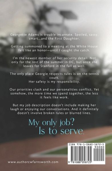 Georgette Adams is trouble incarnate. Spoiled, sassy, smart...and the President's only daughter. Getting summoned to a meeting at the White House felt like an honor-until I caught the catch. I'm the newest member of her security detail. Not only for this summer in DC, but once she leaves for Stanford in the fall as well. Her safety is my responsibility. Trouble is, the only place Georgie respects any rules is on the tennis court. Our priorities clash and our personalities conflict, yet somehow-the more time we spend together, the less it feels like work. But my job description doesn't include making her laugh or enjoying our conversations. And it definitely doesn't involve broken rules or blurred lines. My only job? Is to serve.