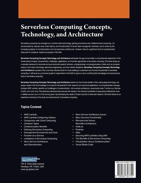 Serverless computing has emerged as a transformative technology, gaining prominence over traditional cloud computing. It is characterized by reduced costs, lower latency, and the elimination of server-side management overhead, and is driven by the increasing adoption of containerization and microservices architectures. However, there is a significant lack of comprehensive resources for academic research purposes in this field. Serverless Computing Concepts, Technology, and Architecture addresses this gap and provides a comprehensive exploration of the fundamental concepts, characteristics, challenges, applications, and futuristic approaches of serverless computing. This book serves as a valuable reference for doctorate and post-doctorate research scholars, undergraduates, and postgraduates in fields such as computer science, information technology, electronics engineering, and other related disciplines. Serverless Computing Concepts, Technology, and Architecture is poised to be a one-stop reference point for those seeking to understand and harness the potential of serverless computing. It will serve as a prominent guide for researchers in this field for years to come, enriching their knowledge and advancing the study of serverless computing.