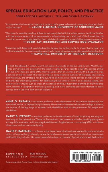 Anne O. Papalia, Ph.D. is an assistant professor at Shippensburg University in the Department of Educational Leadership and Special Education. She teaches courses on instructional methods for students with high incidence disabilities, students with low disabilities, and collaboration. Her research interest includes service dogs in schools, the impact of therapy dogs on students with disabilities, and suicide prevention for people with disabilities. Dr. Papalia has worked as a special educator for students with high and low incidence disabilities in grades K-12, coordinated prereferral intervention teams, and served as a school counselor. She also has been involved in dog training for the past 30 years. She trains and certifies therapy dogs, has trained service dogs for individuals with physical disabilities and returning veterans with PTSD, and is a dog obedience judge. Dr. Papalia earned a Ph.D. in special education from The Pennsylvania State University. She recently authored an article entitled S ervice Dogs in Schools: Legal, Access, and Educational Issues, and co-authored textbook chapters entitled Section 504 of the Rehabilitation Act and Endrew F.: What the future may hold. Kathy B. Ewoldt, Ph.D., is a special education researcher focused on interventions and accommodations to maximize learning in inclusive settings. Her research includes teaching paragraph writing skills to students with Learning Disabilities and English learners, the integration and implementation of technology in inclusion classrooms, and service animal policy. She has seven years' secondary classroom teaching experience with culturally-, linguistically-, and ability-diverse populations in urban environments. Dr. Ewoldt has helped train puppies for future service to assist individuals with visual impairments and has recently co-authored an article Service Animals in PreK-12 Schools: Legal & Policy Implications for School Leaders. Dr. Ewoldt is an Assistant Professor in the Interdisciplinary Learning and Teaching Department at the University of Texas at San Antonio. David F. Bateman, Ph.D., is a professor at Shippensburg University in the Department of Educational Leadership and Special Education where he teaches courses on special education law, assessment, and facilitating inclusion. He is a former due process hearing officer for Pennsylvania for over 580 hearings. He uses his knowledge of litigation relating to special education to assist school districts in providing appropriate supports for students with disabilities. His latest area of research has been on the role of principals in special education. He has been a classroom teacher of students with learning disabilities, behavior disorders, intellectual disability, and hearing impairments, and a building administrator for summer programs. Dr. Bateman earned a Ph.D. in special education from the University of Kansas. He has recently co-authored the following books: A Principal's Guide to Special Education, A Teacher's Guide to Special Education, Charting the Course: Special Education in Charter Schools, Special Education Leadership, Special Education Law Case Studies, and Current Trends and Legal Issues in Special Education. He was recently co-editor of a special issue of TEACHING Exceptional Children focusing on legally compliant IEPs. He is co-founder of the Journal of Disability Law and Policy in Education.