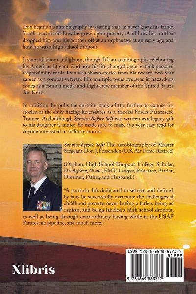 Service before Self: The autobiography of Master Sergeant Don J. Fessenden (U.S. Air Force Retired) (Orphan, High School Dropout, College Scholar, Firefighter, Nurse, EMT, Lawyer, Educator, Patriot, Dreamer, Father, and Husband.) "A patriotic life dedicated to service and defined by how he successfully overcame the challenges of childhood poverty, never having a father, being an orphan, and being labeled a high school dropout, as well as living through extraordinary hazing while in the USAF Pararescue pipeline, and much more."