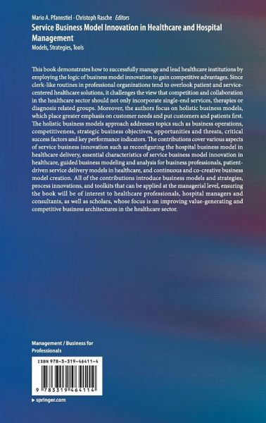 Chapter 1 Service Model Innovation in Hospitals - Beyond Expert Organizations.- Chapter 2 Strategies with Service Business Model Innovation.- Chapter 3 The integrated-Physician-Model - Business Model Innovation in Hospital Management.- Chapter 4 The Role of Digital Disruption in Healthcare Service Innovation.- Chapter 5 The opportunities offered by digitizing clinical pathways.- Chapter 6 A New Perspective of Product-Service Business Models for Customized Manufacturing in Healthcare.- Chapter 7 Patient Driven Service Delivery Models in Mental Health Care.- Chapter 8 Essential Characteristics of Service Business Model Innovation in Healthcare: A Case-Study Approach.- Chapter 9 Characteristics and Drivers of Service Business Model Innovation in Hospitals. A Case Study of Three Mexican Hospitals.- Chapter 10 Business Model Design and Entrepreneurial Risk Evaluation for Health Service Innovations.- Chapter 11 Guided Business Modeling and Analysis for Business Professionals.- Chapter 12 Modeling directly executable processes for healthcare professionals with XMDD.- Chapter 13 Lean Tools for Service Business Model Innovation in Healthcare.- Chapter 14 Continuous and Co-Creative Business Model Creation.- Chapter 15 E-Health & Co-Production: Critical Drivers for Chronic Diseases Management.