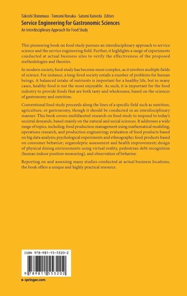 This pioneering book on food study pursues an interdisciplinary approach to service science and the service engineering field. Further, it highlights a range of experiments conducted at actual business sites to verify the effectiveness of the proposed methodologies and theories.