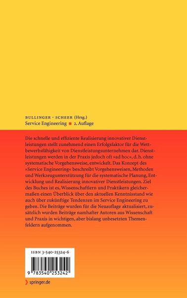 Die schnelle und effiziente Realisierung innovativer Dienstleistungen stellt zunehmend einen Erfolgsfaktor für die Wettbewerbsfähigkeit von Dienstleistungsunternehmen dar. Dienstleistungen werden in der Praxis jedoch oft "ad hoc", d.h. ohne systematische Vorgehensweise, entwickelt. Das Konzept des "Service Engineering" beschreibt Vorgehensweisen, Methoden und Werkzeugunterstützung für die systematische Planung, Entwicklung und Realisierung innovativer Dienstleistungen. Ziel des Buches ist es, Wissenschaftlern und Praktikern gleichermaßen einen Überblick über den aktuellen Kenntnisstand wie auch über zukünftige Tendenzen im Service Engineering zu geben. Die Beiträge wurden für die Neuauflage aktualisiert, zusätzlich wurden Beiträge namhafter Autoren aus Wissenschaft und Praxis in wichtigen, aber bislang unbesetzten Themenfeldern aufgenommen.