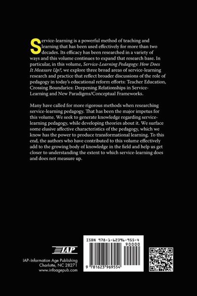 A volume in Advances in Service-Learning Research Series Editor Virginia M. Jagla, National Louis University; Service-learning is a powerful method of teaching and learning that has been used effectively for more than two decades. Its efficacy has been researched in a variety of ways and this volume continues to expand that research base. In particular, in this volume, Service-Learning Pedagogy: How Does It Measure Up?, we explore three broad areas of service-learning research and practice that reflect broader discussions of the role of pedagogy in today's educational reform efforts: Teacher Education, Crossing Boundaries: Deepening Relationships in Service-Learning and New Paradigms/ Conceptual Frameworks. Many have called for more rigorous methods when researching service-learning pedagogy. That has been the major impetus for this volume. We seek to generate knowledge regarding service-learning pedagogy, while developing theories about it. We surface some elusive affective characteristics of the pedagogy, which we know has the power to produce transformational learning. To this end, the authors who have contributed to this volume effectively add to the growing body of knowledge in the field and help us get closer to understanding the extent to which service-learning does and does not measure up.