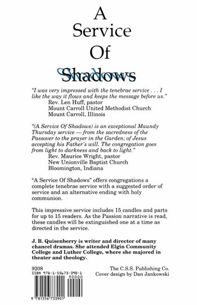 I was very impressed with the tenebrae service... I like the way it flows and keeps the message before us. Rev. Len Huff, Pastor Mount Carroll United Methodist Church Mount Carroll, Illinois (A Service Of Shadows) is an exceptional Maundy Thursday service -- from the sacredness of the Passover to the prayer in the Garden; of Jesus accepting his Father's will. The congregation goes from light to darkness and back to light. Rev. Maurice Wright, Pastor New Unionville Baptist Church Bloomington, Indiana A Service Of Shadows offers congregations a complete tenebrae service with a suggested order of service and an alternative ending with holy communion. This impressive service includes 15 candles and parts for up to 15 readers. As the Passion narrative is read, these candles will be extinguished one at a time as directed in the service. J.B. Quisenberry is writer and director of many chancel dramas. She attended Elgin Community College and Luther College, where she majored in theater and theology.