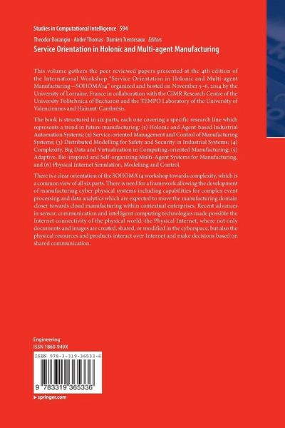 The book is structured in six parts, each one covering a specific research line which represents a trend in future manufacturing: (1) Holonic and Agent-based Industrial Automation Systems; (2) Service-oriented Management and Control of Manufacturing Systems; (3) Distributed Modelling for Safety and Security in Industrial Systems; (4) Complexity, Big Data and Virtualization in Computing-oriented Manufacturing; (5) Adaptive, Bio-inspired and Self-organizing Multi-Agent Systems for Manufacturing and (6) Physical Internet Simulation, Modelling and Control.