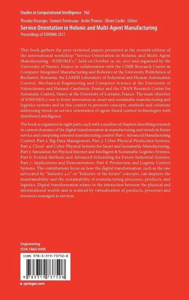 This book gathers the peer-reviewed papers presented at the seventh edition of the international workshop "Service Orientation in Holonic and Multi-Agent Manufacturing - SOHOMA'17", held on October 19-20, 2017 and organized by the University of Nantes, France in collaboration with the CIMR Research Centre in Computer Integrated Manufacturing and Robotics at the University Politehnica of Bucharest, Romania, the LAMIH Laboratory of Industrial and Human Automation Control, Mechanical Engineering and Computer Science at the University of Valenciennes and Hainaut-Cambrésis, France and the CRAN Research Centre for Automatic Control, Nancy at the University of Lorraine, France. The main objective of SOHOMA'17 was to foster innovation in smart and sustainable manufacturing and logistics systems and in this context to promote concepts, methods and solutions addressing trends in service orientation of agent-based control technologies with distributed intelligence.