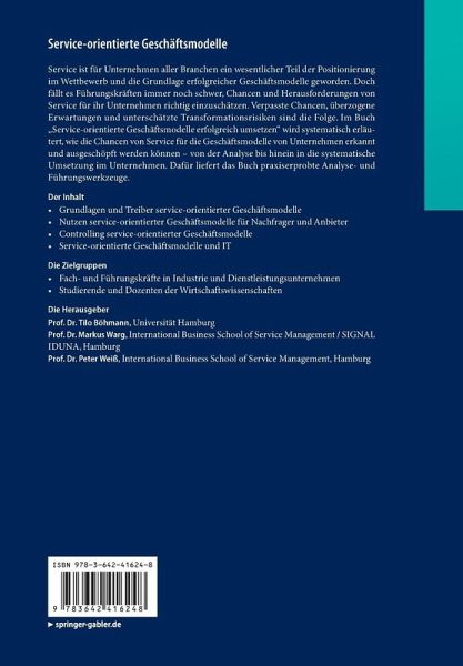 Service ist für Unternehmen aller Branchen ein wesentlicher Teil der Positionierung im Wettbewerb und die Grundlage erfolgreicher Geschäftsmodelle geworden. Doch fällt es Führungskräften immer noch schwer, Chancen und Herausforderungen von Service für ihr Unternehmen richtig einzuschätzen. Verpasste Chancen, überzogene Erwartungen und unterschätzte Transformationsrisiken sind die Folge. Im Buch "Service-orientierte Geschäftsmodelle erfolgreich umsetzen" wird systematisch erläutert, wie die Chancen von Service für die Geschäftsmodelle von Unternehmen erkannt und ausgeschöpft werden können - von der Analyse bis hinein in die systematische Umsetzung im Unternehmen. Dafür liefert das Buch praxiserprobte Analyse- und Führungswerkzeuge.