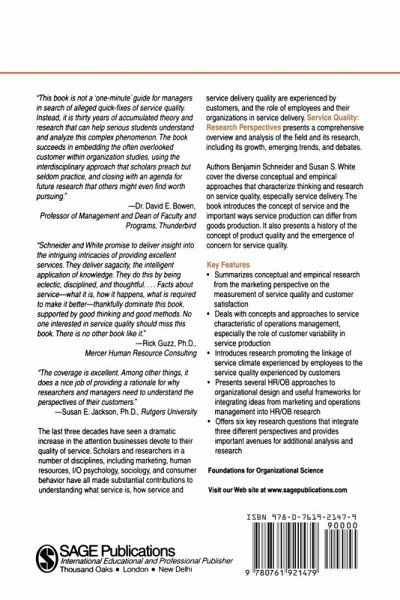 The last three decades have seen a dramatic increase in the attention businesses devote to their quality of service. Scholars and researchers in a number of disciplines, including marketing, human resources I/O psychology, sociology, and consumer behavior, have all made substantial contributions to understanding what service is, how service and service delivery quality are experienced by customers, and the role of employees and their organizations in service delivery. Service Quality: Research Perspectives presents a comprehensive overview and analysis of the field and its research, including its growth, emerging trends, and debates