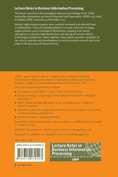 This book constitutes the thoroughly refereed proceedings of the Third Australian Symposium on Service Research and Innovation, ASSRI 2013, held in Sydney, NSW, Australia, in November 2013.